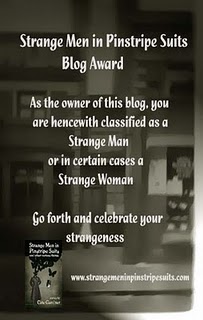 Technically, not awarded as I went following links from Cate’s blog to the award page, and I want to help spread the word for Strange Men. (I said I was stalker-y-ish-ly, didn’t I?) So, since that’s the case for Cate – Strange Men in Pinstripe Suits