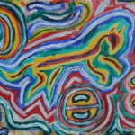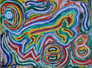 Gina is not only my favorite female author of dark, twisty, horrific materials, she is an extremely talented abstract artist as well. When she posted photos of one piece in particular to her blog, I immediately recognized the symbol she’d painted, the great White Horse from Uffington in the UK. To people of my faith, the site is symbolic of the horse goddess Epona – often referred to as Rhiannon in England and Wales. Naturally I squee’d, and then I went gooey too, cuz she offered it to me as a solstice present! About two weeks later there it was. She made me cry, I’m telling you… and the painting is currently gracing the wall to the right of my desk. When we move, it’s being matted and framed, and will be front and center on the living room wall. PS – no touchy!