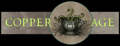 Copper Age is a creative enterprise focused on comics but also producing art, stories, music, video, and pretty much anything else that seems like a good idea at the time. The Copper Age, historically speaking, came before the Iron Age we now live in. Copper is not as good a metal for killing people as iron, but you can make nice body decorations out of it. So that’s Copper Age – Awen touched, tree hugging, in love with folklore and mythology, and far too fond of tentacles to be healthy.